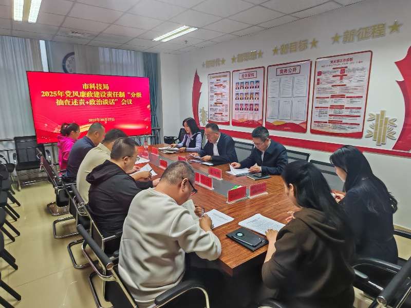 10月27日,乌海市科技局召开2025年度落实党风廉政建设责任制“分级抽查述责+政治谈话”工作会议。市科技局党组书记赵根主持会议,领导班子成员、各科室及二级单位负责人参加会议。