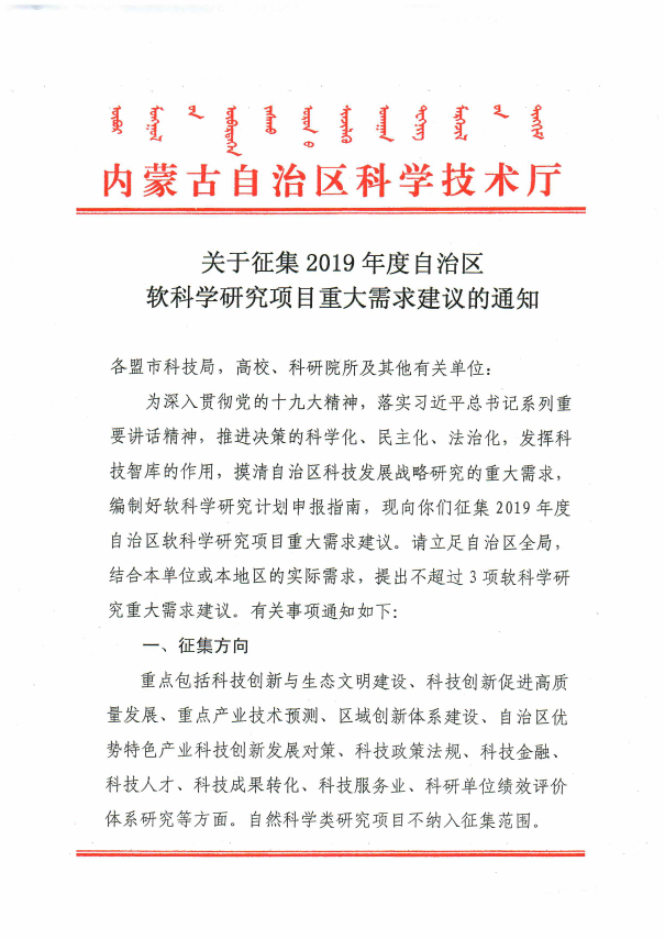 关于征集2019年度自治区软科学研究项目重大需求建议的通知
